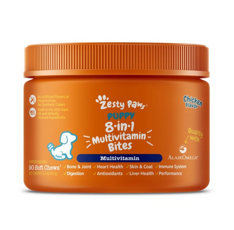 Zesty Paws Multivitamin Treats for Dogs – Glucosamine Chondroitin for Joint Support + Digestive Enzymes & Probiotics – Grain Free Dog Vitamin for Skin & Coat + Immune Health – Puppy – 90 Count